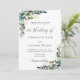 Um fundo branco decorado com verde de eucalipto de cor aquosa, flores de lavanda e folhagem de ouro. Personalize e adicione seus nomes e detalhes do casamento.