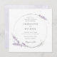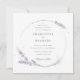 Convite de casamento elegante, com flores de lavanda aquosa, arranjado em uma coroa com um fundo complementar do outro lado.
