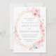 A cereja rosa mais suave que floresce decora uma fina e brilhante estrutura de ouro geométrico. Sakura floresce em cascata pelo lado direito. Apenas algumas folhas verdes criam interesse visual. Algumas flores de cereja aninhadas em folhas são colocadas do lado esquerdo. Uma lavagem cor-de-água rosa mal existe adiciona dimensão. O texto da cinza pálida é leve e arejado. O convite de volta também é cor-de-rosa-claro. O resultado é uma aquarela botânica moderna.