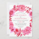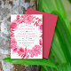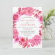 Este convite para o casamento de verão mostra um padrão floral atraente, que consiste em uma coroa enfeitada com flores de rosa e dália e folhagem em tons de rosa e vermelho. O verso do convite tem uma coloração vermelha-rosa.