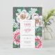 Mão pintou convite de casamento com folhas verdes e flores brancas e cor-de-rosa em fundo de cinza e cores de sotaque de fúcsia. Trabalho de arte original pintado à mão por Caroline Bonne Müller