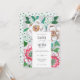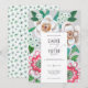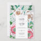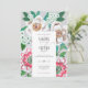 Convite de casamento pintado à mão com folhas verdes e flores brancas e rosas em um fundo cinza e cores de acento fúcsia discretas.