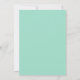 Este convite de casamento tem um tema retrô dos anos 70. O fundo é verde-aqua, com texto castanho e os nomes do casal em letra cursiva. Uma flor branca ao estilo dos anos 70 está no canto inferior direito, com um contorno correspondente em cima.