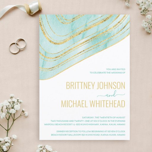 Convites Casamento de Folha de Ouro Azul Aqua Moderna