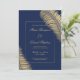 Clássico e elegante marinho tropical azul e ouro sofisticados convites de casamento para palmeiras de palmeiras de tendências. Este e-mail deixa design é perfeito para um evento de tendências e na moda. Personalize este design com sua própria mensagem e informações personalizadas. Todas as designs são impressas.
