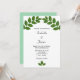 Convite de Casamento branco com folhas de Louro verde elegantes. O verso tem três folhas de louro em fundo verde esmeralda claro. Cartões de convite de casamento com folhas verdes.