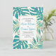 Monstera tropical de chá e ouro e palma de palma deixam convite para casamento. Mostra um padrão de folhas tropicais em azul-lacrimogêneo com contorno de ouro e seu texto em um quadro branco. O verso inclui um padrão de bolinhas dourada sobre o fundo das árvores.