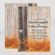 Convites de casamento de outono country com uma floresta de outono rústica com folhas vermelhas, laranja e douradas, árvores de bétula prateada, um coração esculpido de conto de fadas na árvore com as iniciais dos noivos, e um modelo de casamento editável elegante.