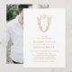 Este elegante convite de casamento de fotos clássicas e ouro branco da Coleção Daphne é perfeito para um casamento tradicional. O simples, porém clássico, design apresenta um elegante e eterno monograma da crista ornamentado, com flores e verde à volta das iniciais do casal. Personalize a parte de trás do seu convite de casamento com a sua foto de noivado favorita.