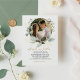 Design apresenta cor d'água verde eucalipto com borda brilhante de ouro floral com foto. Usando uma fonte elegante de caligrafia em ouro para o nome da noiva e do noivo que a faz sobressair.