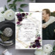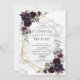 Moderno e moderno, este maravilhoso design de convite de casamento apresenta uma geometria falsa de ouro embelezada com belos rosas de cor d'água roxa e eucalipto verde. Os nomes dos casais e alguns detalhes do casamento estão em uma cor roxa de ameixa. A parte traseira da placa apresenta sua foto favorita do noivado. Copyright Elegant Invites, todos os direitos reservados.