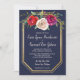 Um belo convite para o casamento floral, com flores brancas, vermelhas, ameixas e natas-rosa + uma moldura dourada contra um fundo azul-marinho. O verso do convite traz uma foto da futura noiva e noiva. Por favor, entre em contato comigo se você quiser ajuda para personalizar este convite de casamento.