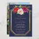 Um belo convite para o casamento floral, com flores brancas, vermelhas, ameixas e natas-rosa + uma moldura dourada contra um fundo azul-marinho. Apresenta quatro fotos da noiva e do noivo nas costas. Por favor, entre em contato comigo se você quiser ajuda para personalizar este convite de casamento.