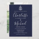 Apresentando a âncora de um navio e nomes de estilo de assinatura, este elegante convite náutico para casamento pode ser personalizado com suas informações em letras brancas em um fundo azul marinho com sua foto escolhida no verso. Projetado por Thisnotme©