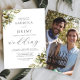 Este convite de casamento rústico tem arranjos de galho de oliveira em dois cantos. A palavra "casamento" aparece em escrita caligráfica. Personalize o texto da cinza de carvão com os nomes da noiva e do noivo e os detalhes do casamento. Substitua facilmente a imagem de exemplo no verso por sua própria foto vertical favorita.