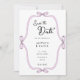 Defina o tom para o seu próximo casamento com este cartão de datilografo "Salve a data" com um quadro de fita rosa desenhado à mão e uma tipografia elegante. Os arcos macios e brincalhões adicionam um toque de charme e romance enquanto mantêm o design fresco e moderno. Totalmente personalizável com seus nomes, data e detalhes de local, este convite é perfeito para casais que querem algo doce, mas na moda. Ideal para casamentos de primavera, cerimônias de jardim, ou qualquer celebração com um tema delicado e romântico. Adicione sua foto pessoal atrás para um toque extra especial