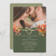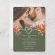 Celebre seu casamento de outono em estilo com este convite de casamento outono rústico, com uma foto de casal romântica, uma folhagem de laranja vibrante e um coração de corda de ouro simbólico. Os tons verdes de oliveira e sábio criam uma vibração da terra, do boho moderno, enquanto a tipografia elegante e um RSVP embutido com código QR oferecem charme e conveniência. Perfeito para casamentos outono exteriores ou rurais com talento rústico-chic.