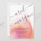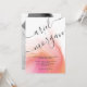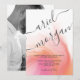 Cor de rosa e laranja com Cinza Script Photo Wedding Invitation Este convite de abstrato moderno apresenta um fundo de aquarela cor rosa e laranja com o nome do casal escrito na caligrafia decorativa da cinza. Personalize a parte de trás deste convite com uma fotografia e uma pequena mensagem personalizada da sua escolha. As cores incluem rosa, laranja, branco e cinza, cinzas.