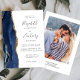 A borda esquerda deste elegante convite de casamento moderno apresenta um marinho azul de aquarela agata borda aparada com falso brilho dourado. O texto personalizável combina a escrita manual de cinzas de carvão, as fontes em copperplate e itálico em um fundo branco. No verso, substitua facilmente a imagem de exemplo por sua própria foto e adicione algumas linhas de informações adicionais, como o URL do site de casamento.