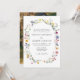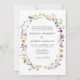 Convites florais elegantes com detalhes de seu casamento cercados por um quadro oval de flores silvestres e folhagem de cor d'água em tons de rosa, amarelo, roxo, azul e verde. O convite inverso para exibir sua foto de noivado vertical com sangramento de cheio. Os convites para casamento de flor selvagem rústica são perfeitos para casamentos de primavera e verão.