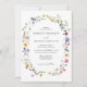 Convites florais elegantes com detalhes de seu casamento cercados por um quadro oval de flores silvestres e folhagem de cor d'água em tons de rosa, amarelo, roxo, azul e verde. O convite inverso para exibir sua foto de noivado vertical com sangramento de cheio. Os convites para casamento de flor selvagem rústica são perfeitos para casamentos de primavera e verão.