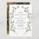 Convites florais elegantes com detalhes de seu casamento cercados por um quadro oval de flores silvestres, folhagem e borboletas em tons de amarelo, roxo, azul, laranja e verde. O convite inverso para exibir sua foto de noivado vertical com sangramento de cheio. Os convites para casamento de flor selvagem rústica são perfeitos para casamentos de primavera e verão.