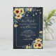 Crie o convite perfeito para o casamento com este bonito girassol rústico e marinho azul d'água, design floral, com madeira azul marinho, luzes de cordas e tipografia com guião escrita. A parte de trás do convite apresenta a sua fotografia de noivado favorita. Entre em contato com o designer para produtos correspondentes. Copyright Elegant Invites, todos os direitos reservados.