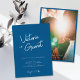 Um simples e elegante convite para casamento moderno em azul e branco. Apresentando uma fonte de script manuscrita para os nomes emparelhados com texto moderno limpo. Personalize o texto, os nomes, as fotos e as cores de fundo para ajustado do seu tema de casamento exclusivo. Este convite é adequado para cerimônias e recepções de casamento modernas, modernas ou informais. Preencha a papelaria do casamento com o resto da nossa Coleção de Casamentos de Script Mínimo Moderno.