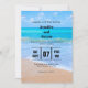 Um convite de casamento de destino com uma fotografia de uma cena clara de oceano azul com ondas suaves ao longo de uma areia marrom e costeira macia. Um céu azul com nuvens fofinhas à distância. Localidade idílica tropical serena.