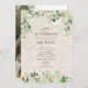 Crie o convite Rustic Wedding perfeito com este design com a cor d'água eucalipto e verde botânico ferno, em fundo falso latido de pássaros. Sua foto de noivado favorita aparece no verso. Copyright Elegant Invites, todos os direitos reservados.