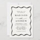 Apresentando o convite de casamento do Modern Black Wavy Frame, onde boho encontra retrô em uma celebração harmoniosa do amor! Com as letras negras dançando através do convite para creme leve, enfeitado com um quadro ondulado que lembra o charme de vintage, este design cômico define o tom perfeito para seu dia especial. Personalizado com os nomes dos casais e os detalhes do casamento, cada elemento exumenta um ar de nostalgia e elegância moderna. O convite reverte para exibir sua foto de noivado vertical com seu site de casamento mostrado abaixo. Aceite o encantamento de sua união com este convite único, convidando seus convidados a se juntar à alegria de sua história de amor boho-retrô.