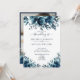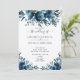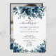 Este romântico, rústico convite para casamentos de aquarelas florais apresenta uma queda floral, com texto de convite no estilo moderno rústico elegante com tipografia escrita à mão. A parte de trás do convite apresenta a sua foto favorita do noivado, atrás de um quadro azul marinho e flores azuis. Copyright Elegant Invites, todos os direitos reservados.