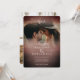 Um convite de casamento rústico moderno e na moda apresenta iniciais de monogramas quic seguidas de uma foto sobreposta com pintura de abstrato de ouro rosa e um texto clássico de informações de casamento em cor branca e foto atrás.