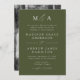 Convite de casamento minimalista e moderno com as iniciais do monograma e detalhes de casamento mostrados em letras brancas com acentos de escrita de caligrafia. O fundo verde-oliva pode ser mudado para uma cor de sua escolha. A parte de trás do convite de casamento do monograma mostra sua foto de noivado vertical. Projetado para coordenar com a nossa coleção de casamento do Modern Elegance.