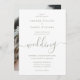 Convide a sua família e amigos para a sua elegante festa de casamento verde sábio com estes convites de casamento de fotos verdes minimalistas, mas elegantes, com uma letra moderna. Itens correspondentes disponíveis.