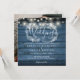 Um convite de casamento rústico com luzes bonito de cordas e uma delicada garland floral rústica desenhada à mão de folhagem botânica com tipografia de na moda, sobre um fundo de madeira rústica azul com sua foto especial no verso. Projetado por Thisnotme©