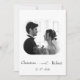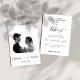 Um elegante convite de casamento preto e branco apresenta um eterno e sofisticado. O texto é tipicamente apresentado numa fonte de serifa ou caligrafia refinada, com letras negras num fundo branco nítido. Elementos minimalistas como delicadas bordas, monogramas ou arte floral de linha adicionam charme sutil. O design evita a confusão, focando-se em um layout limpo e equilibrado para transmitir um sentido de elegância e formalidade clássicas.