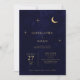 Um convite de casamento celestial moderno minimalista apresenta uma design simples e elegante. Inclui uma lua de folha de ouro e estrelas que brilham suavemente, colocadas sobre um fundo azul da meia-noite com uma foto no fundo que pode ser personalizada. O convite usa a tipografia serif clássica, que adiciona um toque tradicional e formal com seu estilo limpo e limpo. A combinação de design moderno, detalhes brilhantes de ouro e fontes eternos torna o convite bonito e convidativo, perfeito para anunciar um dia especial e elegante de casamento.