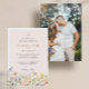 Este convite de casamento para na moda e elegantes monogramas apresenta flores silvestres de aquarela, folhas, libélulas em paleta de cor aquosa de rosa, azul amarelo e verde. No verso, você tem espaço para sua foto favorita na orientação vertical ou retrato. Perfeito para primavera, verão ou casamentos outono, jardim ou celebração ao ar livre.