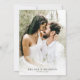 Um convite de casamento elegante Eucalyptus verde com uma tipografia simples e mínima e uma fotografia de cheio do casal na parte de trás do cartão.