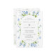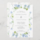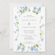 Um bonito convite de casamento em azul, com flores azuis de cor d'água e verde em volta de uma trendy pill frame.