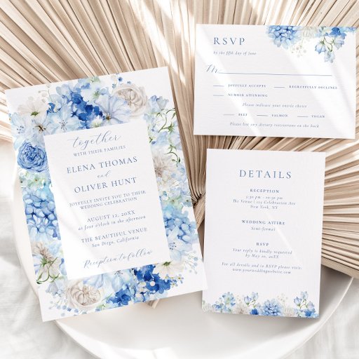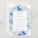 Este convite para o casamento apresenta um quadro floral de aquarela com flores elegantes em diferentes tons de letra azul e escrita à mão. Com seu sofisticado quadro floral e atenção aos detalhes, este convite dará o tom para um casamento memorável e elegante.