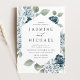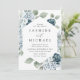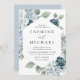 Elegantes convites para casamento floral com seus detalhes de casamento cercaram um quadro geométrico com rosas poeirentas, azuis e brancas, hidrangeas, folhas de eucalipto e verde. Este convite de casamento floral azul empoeirado é perfeito para o seu primavera ou casamento de verão!