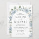 Convites de casamento florais elegantes que incluem seus detalhes de casamento com um quadro floral arquivado de rosas poeirentas, azuis e brancas, hidrangeas, folhas de eucalipto exuberantes e verde. Este convite de casamento floral azul empoeirado é perfeito para o seu primavera ou casamento de verão!