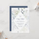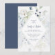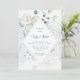 Flores de inverno em tons de azul empoeirado, verde-sábio, branco e creme rodeiam uma armação em forma de diamante com seu dentro de detalhes de casamento. As caixas de texto são fáceis de personalizar usando uma mistura de fontes modernas e caligráficas em cinzas médias e azul-poeirento escuro. A parte de trás do cartão é azul empoeirado escuro.