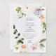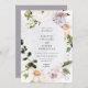 Moldura floral de cor d'água elegante, convite para casamento. A placa apresenta belas flores botânicas de jardim com aquarela, sotaque de fundo de renda vintage e elementos de folhagem luxuosa. Estilo simples de design de tipografia de classe, e coordenação de sombra de cor roxa.