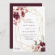 Este convite para o casamento inclui buquês de flores de aquarela de dália, rosa de jardim, peônia, capim de pampas, e hydrangea em vermelho-burgundy, terracotta, cor-de-rosa-pincelada sobre folhas de outono com uma falso estrutura geométrica de ouro. Para uma personalização mais avançada deste design, clique no BOTÃO FERRAMENTA DESIGN AZUL. Itens correspondentes também estão disponíveis.