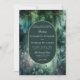 Uma ilustração com uma aquarela esbranquiçada da folhagem esmagadora em verde esmeralda, cintilante com luzes de fadas e poeira mágica, decora este convite de casamento outono de verão com um tema de floresta encantado. Também apresenta uma escaravana esmeralda de ouro e uma estrutura oval de ouro que fixa a atmosfera para uma noite encantada e uma noite mágica. Um convite elegante e moderno para um casamento de conto de fadas. Perfeito para noivas que amam o cenário de conto de fadas, o tema da floresta de fadas ou do jardim de fadas e o verde esmeralda, e quadros elegantes.