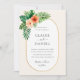 O convite para casamento moderno mostra folhas tropicais de cor d'água, incluindo monstera e palma, com flores de hibisco e verde-peluche num elegante quadro oval. O verso apresenta uma cor verde escura, ideal para casamentos tropicais, de praia ou de destino.