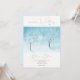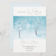 Convite de casamento com a paisagem de inverno com aquarela em tons azuis. No centro estão duas árvores cobertas de geada de neve, os ramos das árvores criam uma fina teia contra o céu e se estendem em direção umas às outras no charme de inverno criando uma imundície por muitos anos. Convite para casamento fresco de inverno. Coleção de Febre de inverno.